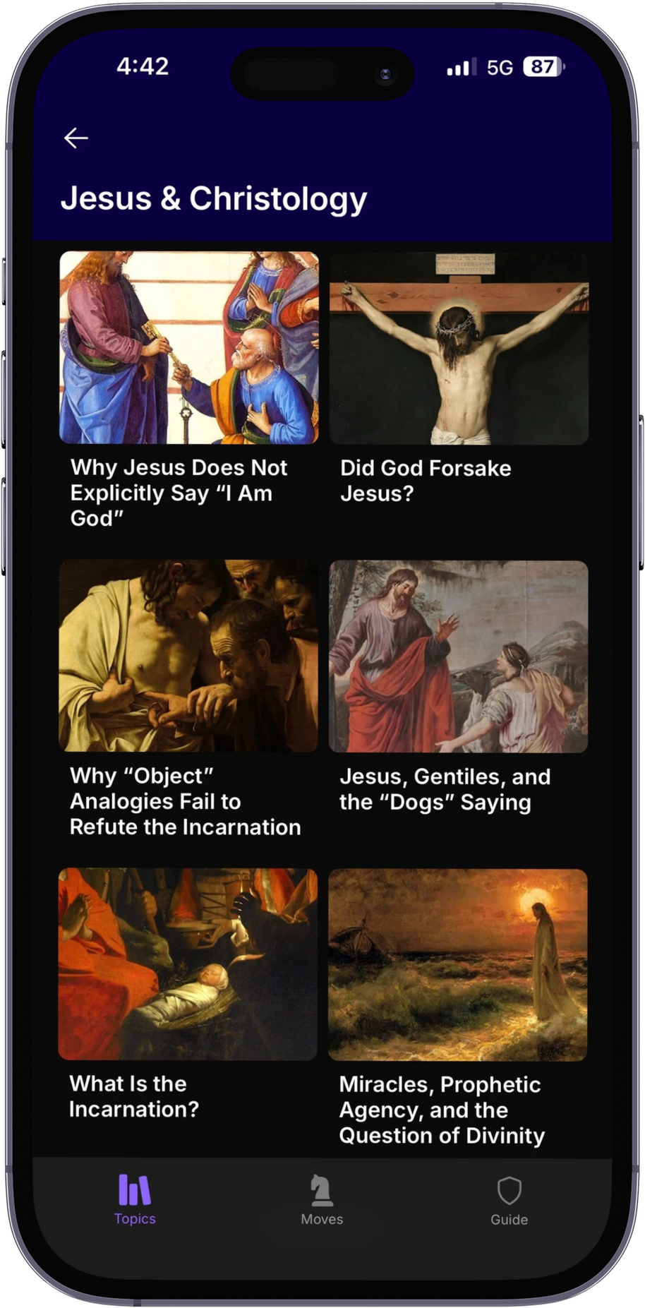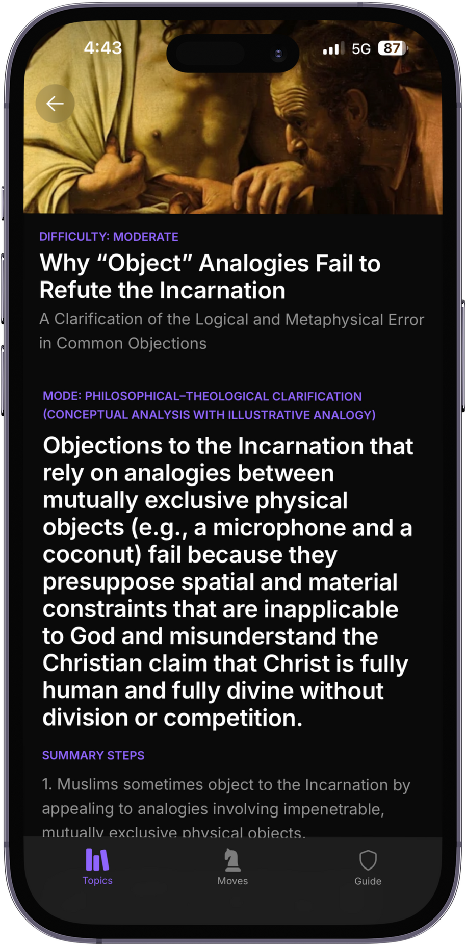 The app also addresses how real conversations actually unfold.In addition to content, it includes guidance on recognizing common rhetorical moves, responding without defensiveness, and maintaining clarity and patience under pressure.